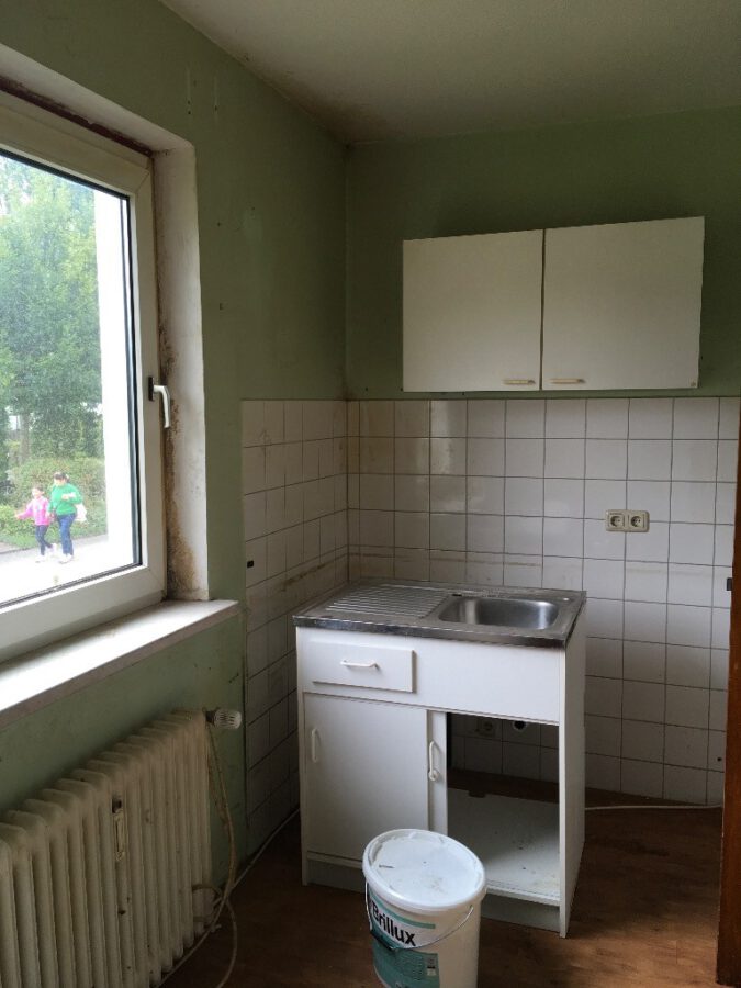 Die Wohnung wird mit einer Grundausstattung in der Küche bereitgestellt. Diese beinhaltet einen Elektroherd mit Ofen und eine Spüle mit Unterschrank.